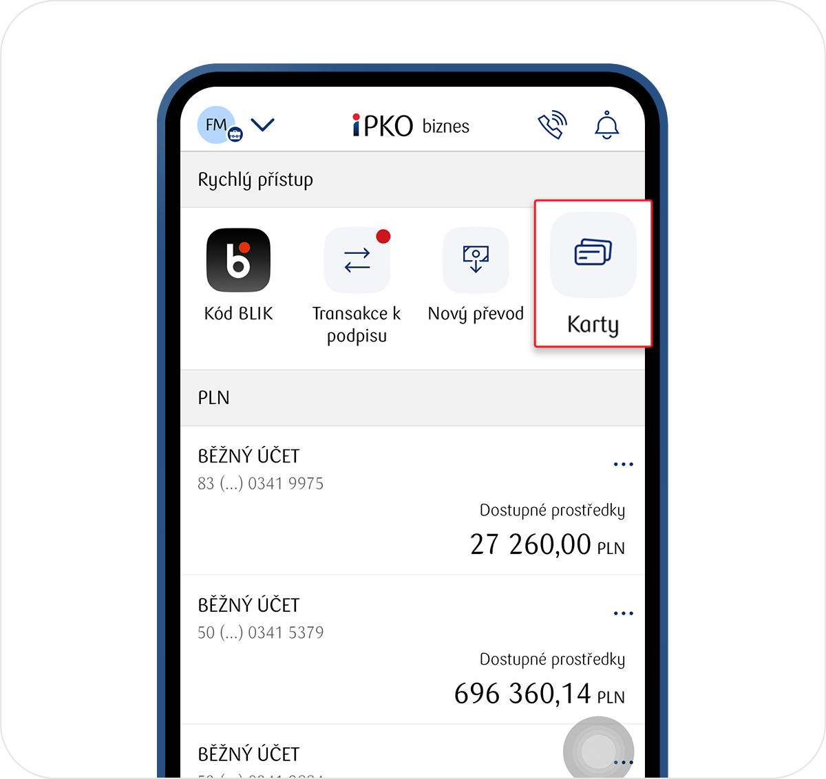 V aplikaci, v režimu přístupu k iPKO biznes, uvidíte všechny své firemní karty bez ohledu na to, do kterého firemního kontextu se přihlásíte. Najdete je v novém menu v záložce Karty.